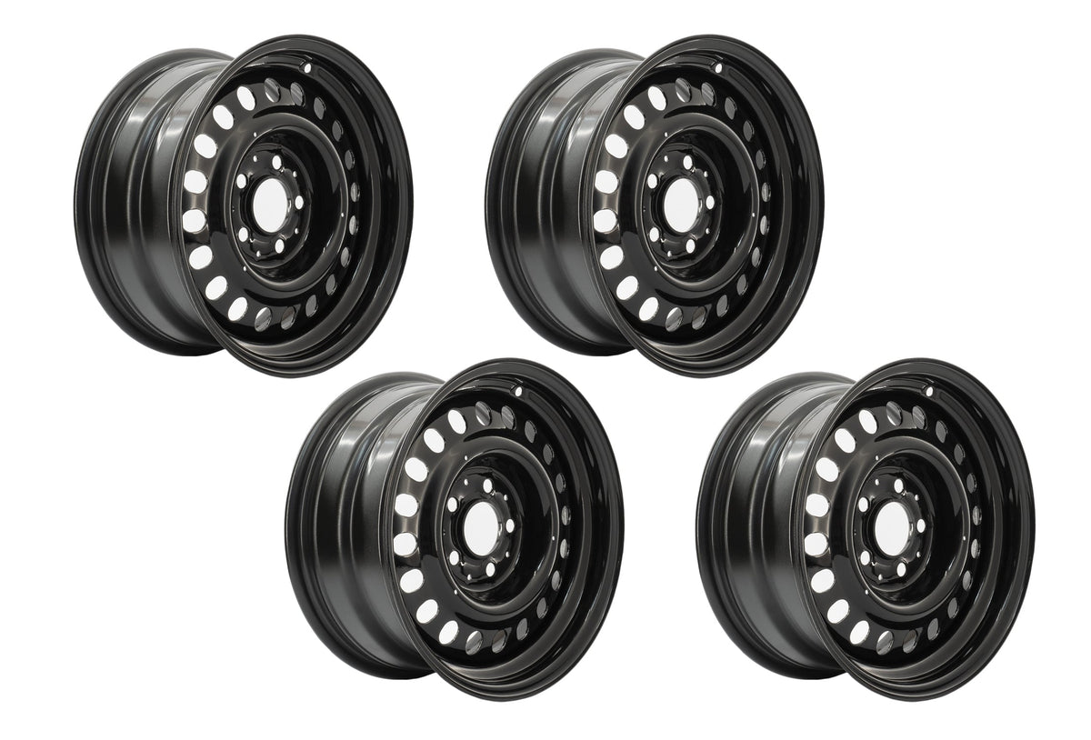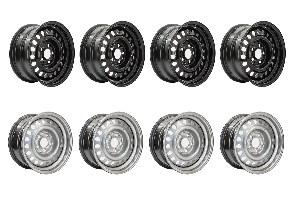 • This wheel package includes four (4) steel wheels finished in silver or black paint, plus black mounting hardware. Please make your selections in the drop-down menu.